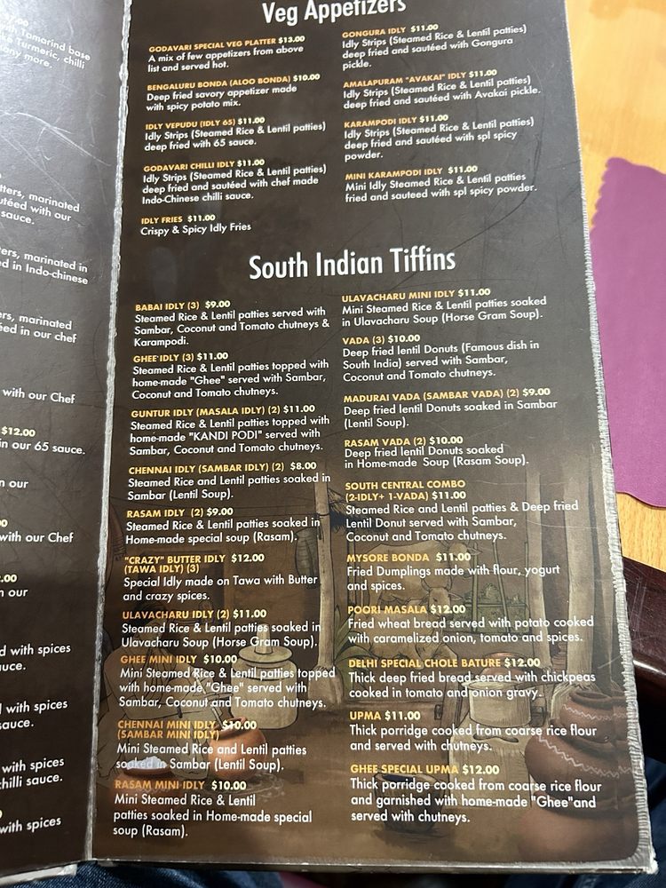 Introducing the menu at Godavari, a delightful Indian restaurant in Wilmington, DE. This casual dining spot offers a wide variety of vegetarian and non-vegetarian options, including unique South Indian tiffins and flavorful non-veg appetizers. Customer reviews rave about the chicken tikka masala and garlic naan, showcasing the restaurant's culinary excellence. The ambiance is welcoming, the service friendly, and the portion sizes are appropriate. From spicy chilli chicken to delicious vada and idly combos, Godavari caters to all palates. Don't miss out on their delectable veg pakoda and egg bonda. With options for pescatarians and vegans, along with convenient amenities like reservation options and delivery services, Godavari is a must-visit for food enthusiasts seeking authentic Indian flavors in a comfortable setting.